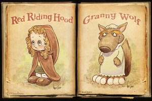 Most of the time he begins with a sketch that establishes the structure of the character and a follow-up color comp so I know what color wool to use.  Then I start sculpting.  Not only do those sketches turn into a wool doll, but most of the time he brings the illustration to a more finished stage.  That’s what this image is.  I love the old timey look he gave to Red and the wolf.