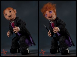 These guys are wearing a three piece suit all made out of wool. Sharp! I really enjoyed needle felting the spats on the shoes and the tails on the coat. I didn’t even know what spats were until my designer explained them (He’s got this thing about old timey-time stuff). The only things that aren’t wool are the eyes and the props. Unfortunately for both me and Hyde, that’s not a real diamond on his walking stick.