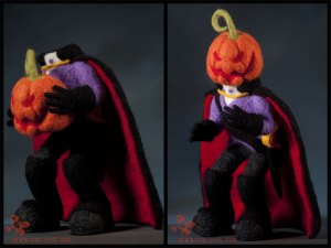 His outfit was entirely needle felted in Norwegian wool. Vince Dorse, who designed this doll (and my Invisible Man and Jekyll & Hyde), planned to have these three dolls exist as a set. So they not only share a theme and literary origin, but all three dolls share a few, key colors (red, purple and black). So, if you’re out riding through Sleepy Hollow tonight, beware. You may just have a tiny, wool jack-o-lantern hurled at your head. I’ll be posting the concept art soon so stay tuned for that.