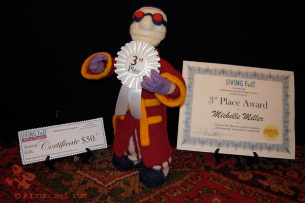 Here’s my Invisible Man doll showing off the 3rd Place ribbon he won in the Living Felt International Felting Contest.  He’s such a ham.  Also in the photo are the Award Certificate and Gift Certificate that the nice people at Living Felt (http://feltingsupplies.livingfelt.com/) sent me.  It was such a nice surprise to come home to.  When I pulled the package out of my mailbox it was like winning the prize all over again.  I can’t thank them enough.