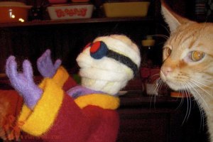 One of the problems I have felting at home is the danger posed by Bing and Bowie, The Cat Brothers. They’re cute, they’re loving, and I don’t know what I would do without them. But, like all cats, they’re very curious. And their curiosity can sometimes turn a felted doll into a kitty chew toy.