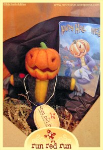 The Pumkinhead Scarecrow found a home! Thanks to SpookyTime Jingles for hosting the sale (as they do every month) and a big thank you goes out to the buyer. She’ll be receiving the scarecrow, of course, and a “vintage” Halloween thank you postcard designed by my friend Vince Dorse (that just happens to match the scarecrow…so it works out quite well).