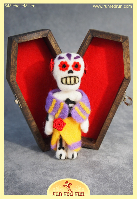 I hate to see Halloween pass. Of course, as a Halloween is winding down, Dia de los Muertos is just getting started! Today we think of the Day of the Dead as a Mexican holiday, but the foundations of the holiday predate the arrival of Europeans in Mesoamerican by thousands of years. I can’t let the festival pass by without a contribution. This year I made a little Catrina with a felted shawl and skirt and wooden coffin. I love making these little guys. It’s the detailing and ornamentation of the skulls the appeals to me. Overall, the day of the dead isn’t a morbid time. It’s a celebration to remember the loved ones we have lost. I think the art of the holiday is meant to take the fear out of death and maybe to remind us death is a just another part of life.