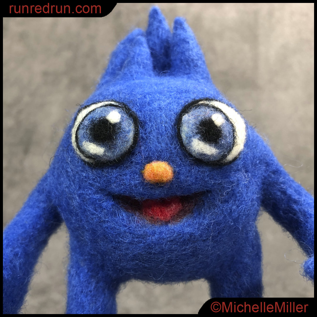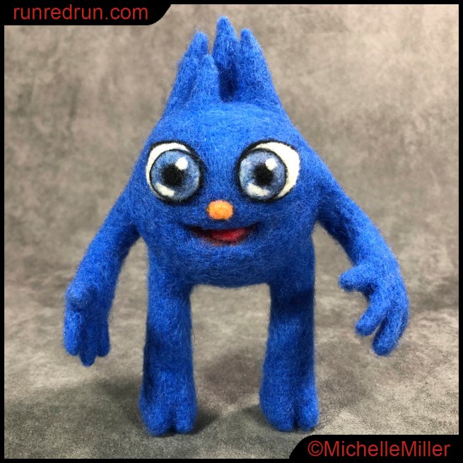 I felted irregular peaks at the top of his head to give the sense of the longer tufts the character has. They’ll be more durable and hold their shape over time without matting. The client was happy with the final product so I’ll call that a win.