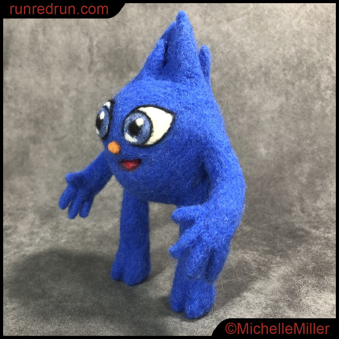 Beeboo is a Winkle, a travel companion of the titular Little Warrior. He’s furry and blue, which you’d think would be a natural for needle-felting, but you do have to take some things into consideration when you’re transferring a character like this from 2D to 3D.